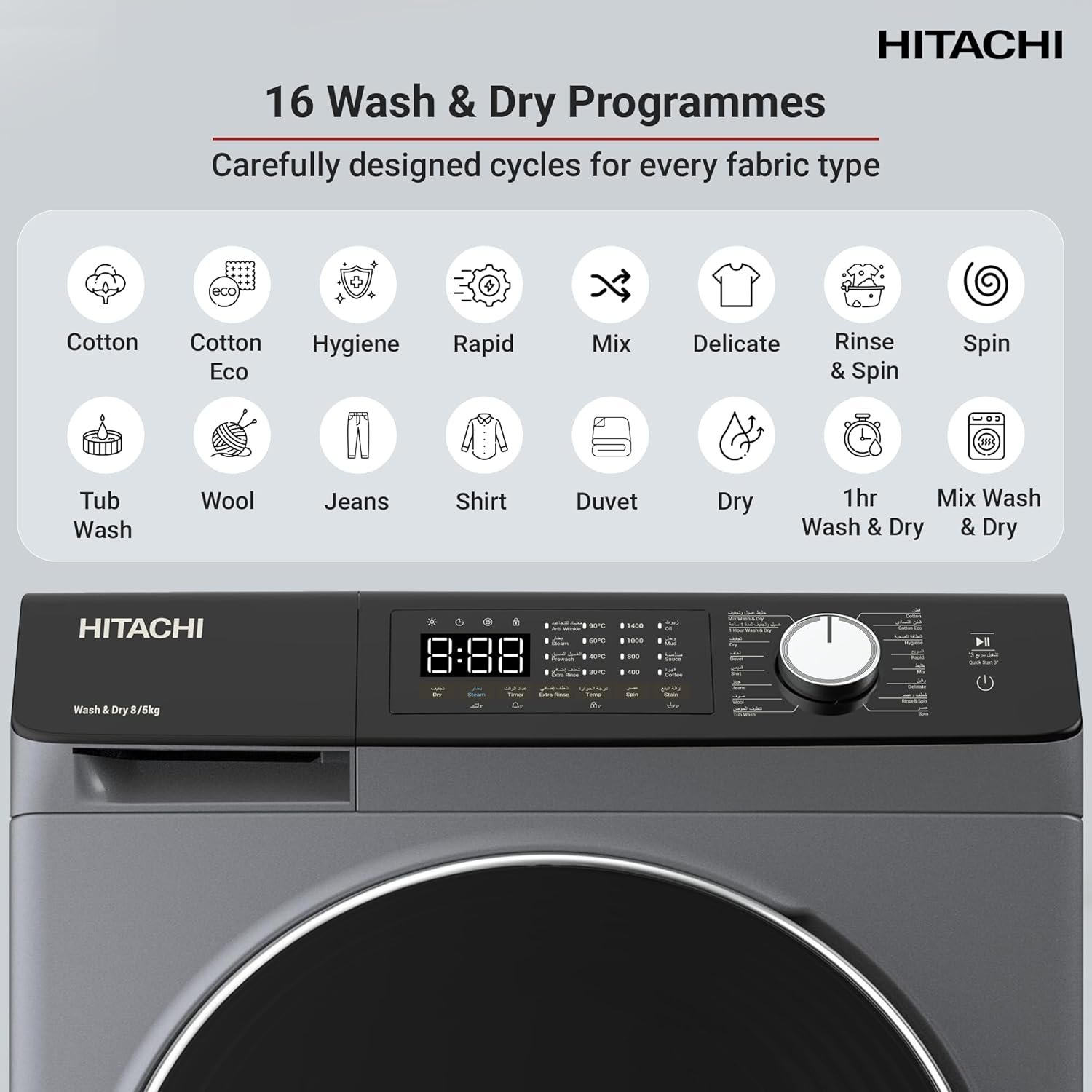 غسالة هيتاشي اتوماتيك امامية 8/5 ك فضي تنشيف 100 %BD-D802HVOS